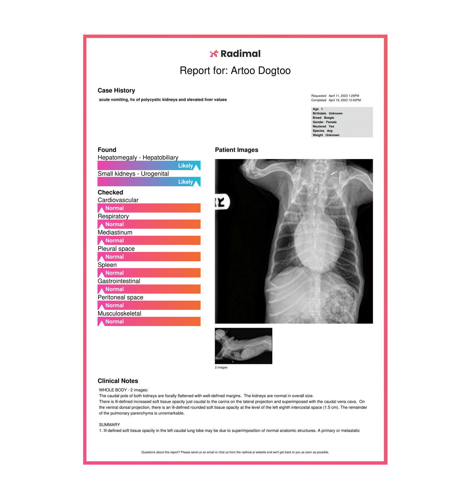 Radimal is a veterinary radiology platform that combines board-certified expertise with AI-powered insights to deliver fast, accurate radiology reports. We help vets provide better patient care with guaranteed turnaround times and stress-free collaboration.